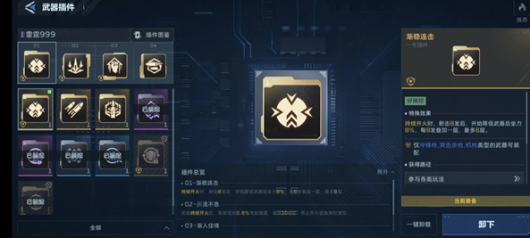 插件1号位:推荐【渐入连击】,可以大幅降低999的后坐力让输出更加稳,官方推荐的大弹夹就不需要了一点子弹都不提升,这把武器的被动就是上限999发子弹,所以吃不到弹夹加长。