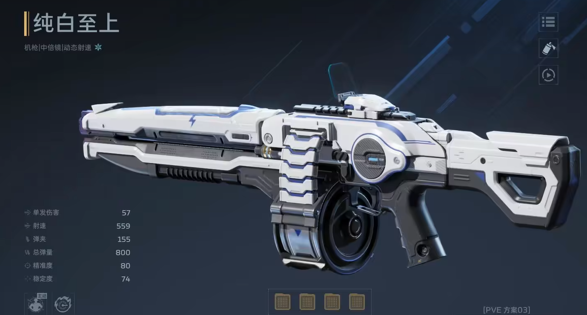 还有一把主武器叫纯白至上,这枪的数据面板看着比雷霆999更漂亮一些,就是换弹时间稍微长了点,不过配合插件也能解决这个毛病。小编感觉它开箱的概率比999低一些,所以放在第二个讲。它的主动技能叫磐石身躯,开启后会有个力场保护,能减少28%的伤害,同时持续射击的话每0.25秒还能叠加8%的增伤效果,最高可以叠到96这个加成就很夸张了。而且触发条件特别简单,基本上战斗过程中都能保持高增伤状态。被动技能强力冲击也很给力,射击的时候射速会慢慢提升,最多能提升100%,本来射速就不慢,现在还能翻倍,打起来手感特别好。