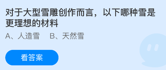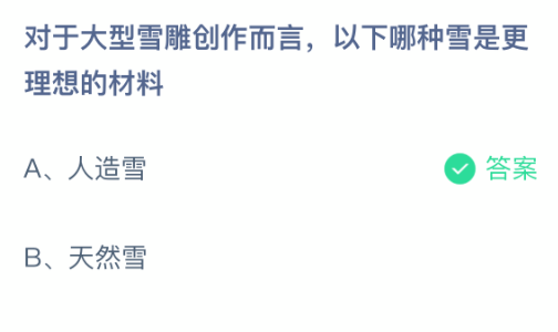 对于大型雪雕创作而言,以下哪种雪是更理想的材料?支付宝小鸡课堂开课啦!每天花一分钟答题赚饲料,喂喂小鸡就能贡献爱心啦!轻松又意义十足!2026年1月18日蚂蚁庄园的小鸡课堂题目正确答案是【人造雪】,对于大型雪雕创作而言,人造雪是更理想的材料。