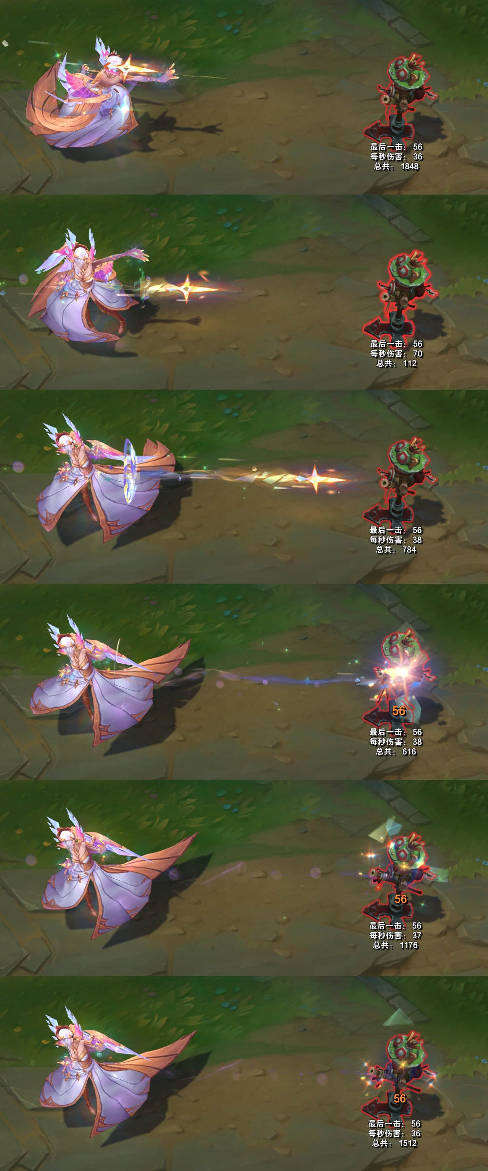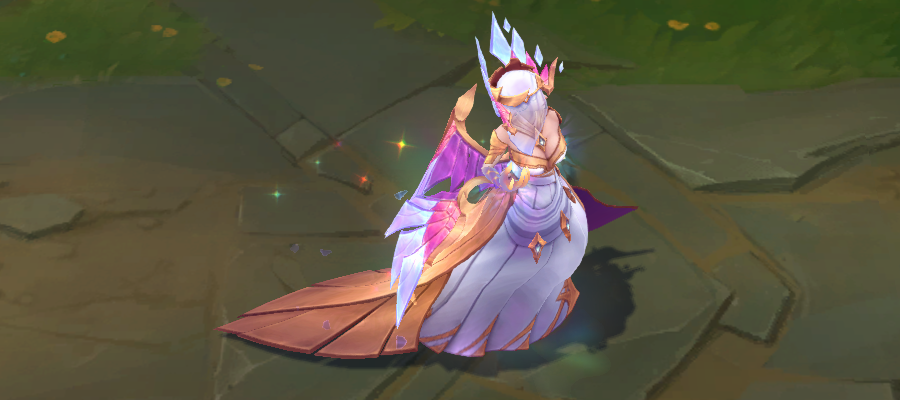 模型方面,手上不停向外散发出彩绘玻璃样子的光效,模型底部有亮光,身体周围会有闪光粒子和水晶碎块。