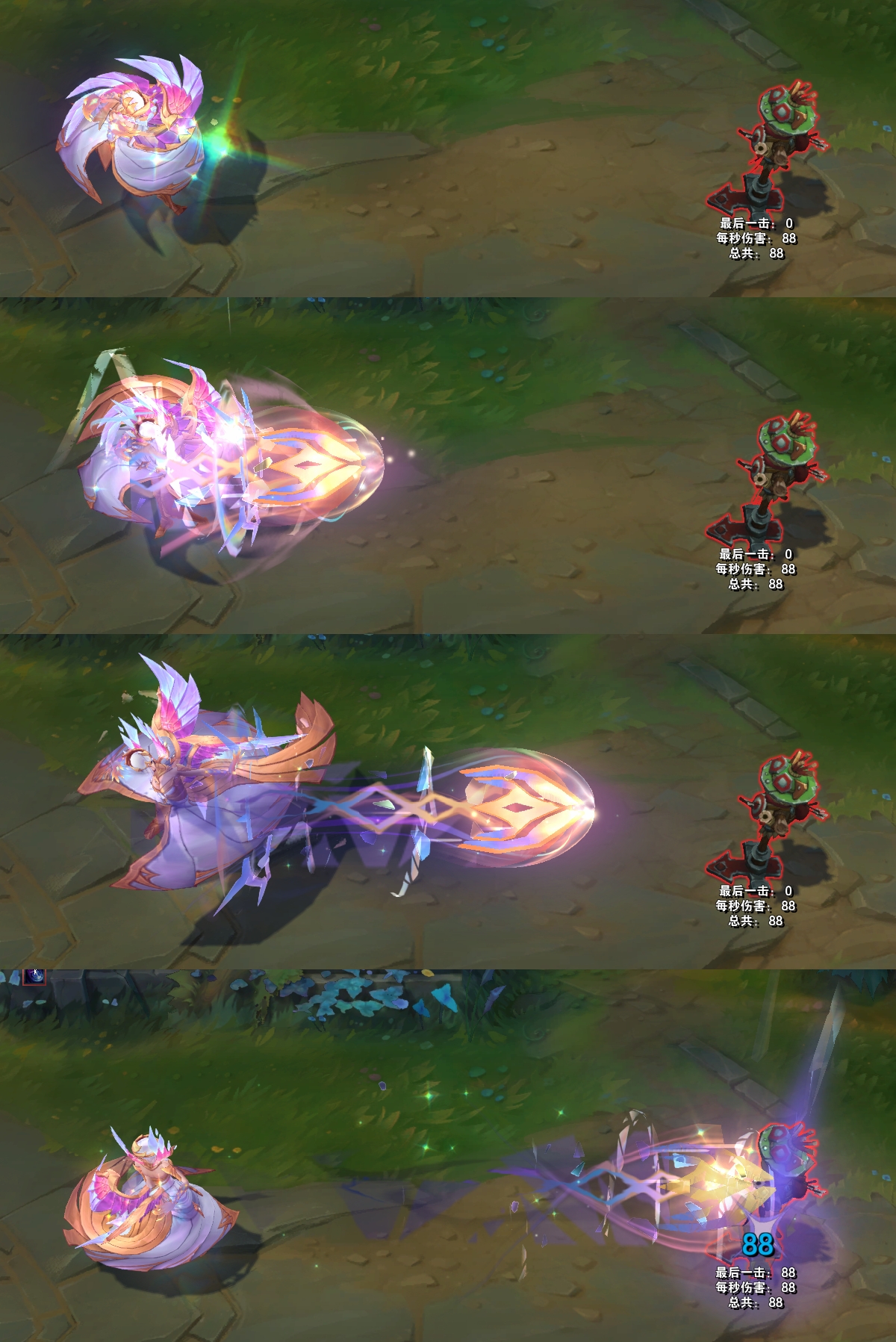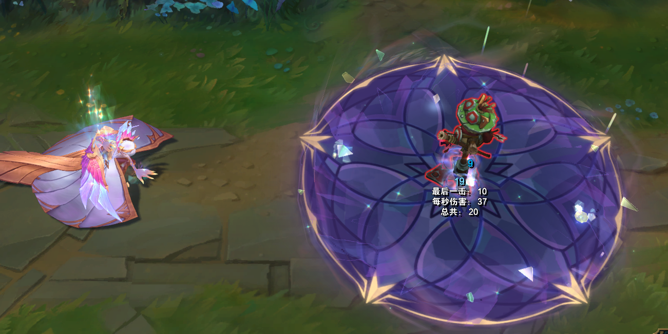 W技能,一把剑从天而降,地面上出现青绿色的亮光以及光晕,区域内是彩绘玻璃的图案,表面还会出现一些钻石。