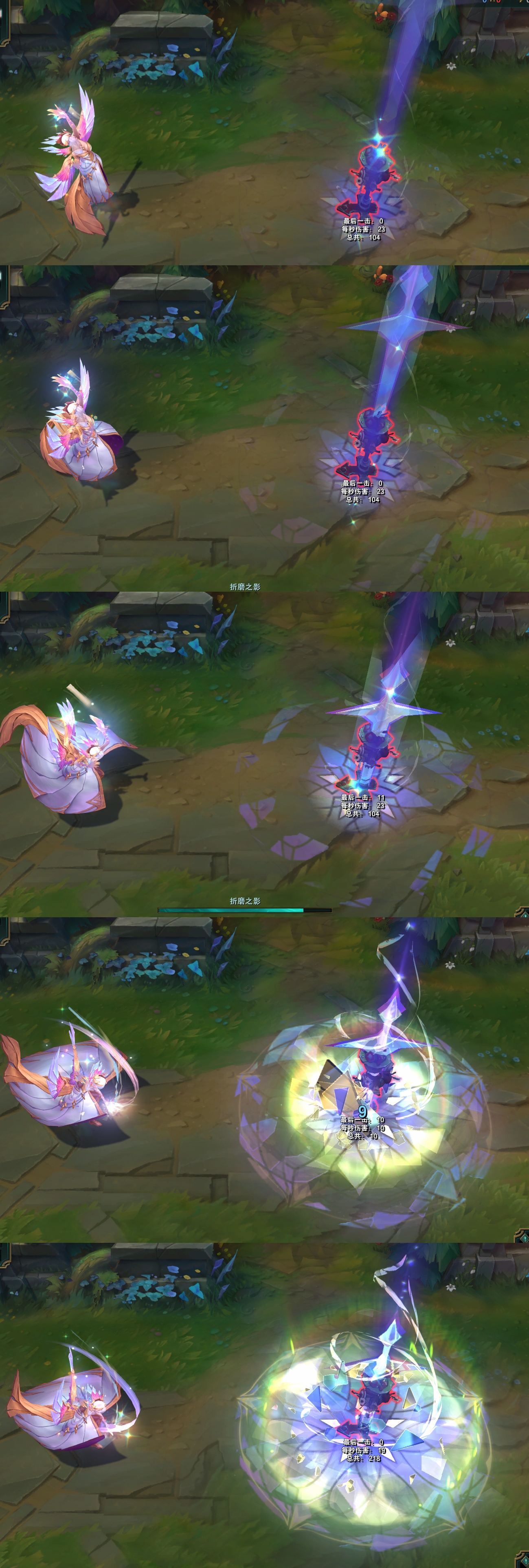 Q技能,飞弹变成了锁链,身体前方的圆环也是锁链的造型,命中时,会出现玻璃碎裂的效果,禁锢时,从天上掉下剑围着插在地面上。