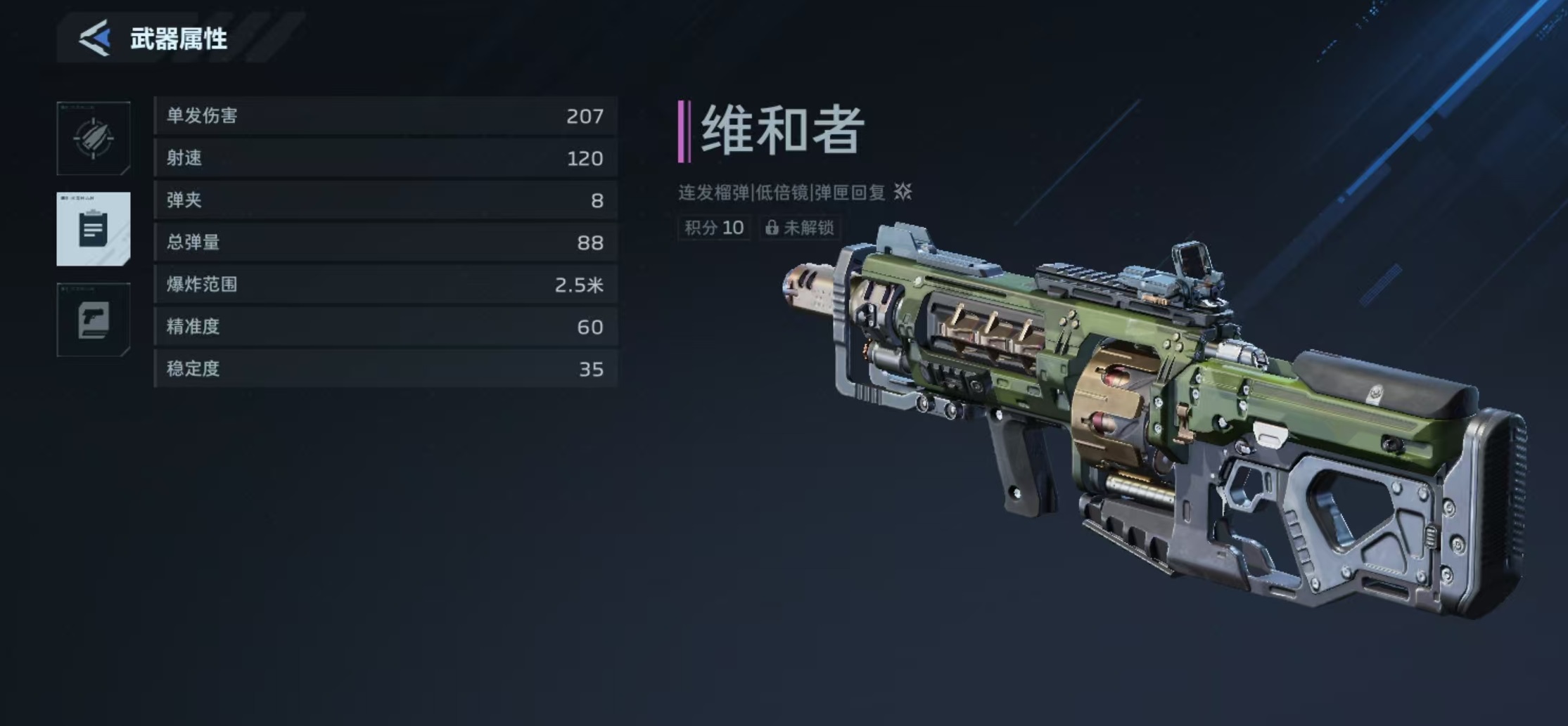 首先,维和者这把武器,定位就是重型支援,专门用来压制成群的敌人。它自带一个低倍率的光学瞄具,方便你在中近距离快速锁定目标。咱们来看看它的硬核数据:单发爆炸伤害207点,理论射速能达到每分钟120发,弹匣容量8发,总共能带88发榴弹,爆炸有效半径足足有2.5米!这些数字加起来,就构成了它那种覆盖范围广、输出节奏感强的独特风格。