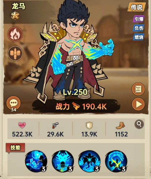 虽然目前我们已经知道了天赋的效果,但想要找到最合适的加点方法,还是要结合技能以及机制来判断。他的技能组中一共有一个攻击技能和三个辅助技能,我们先来看主要攻击技能焰煌百裂拳,这个技能会对随机四名敌人造成210%攻击力的伤害,同时引爆敌人身上的负伤和燃烧,引爆一次后印记会随之消失。然后是辅助技能极星烈龙身,龙马收到带有负伤的目标攻击的时候,自身获得6%的伤害增加,持续两回合,如果攻击自己的人拥有燃烧印记则回复60%的生命值。