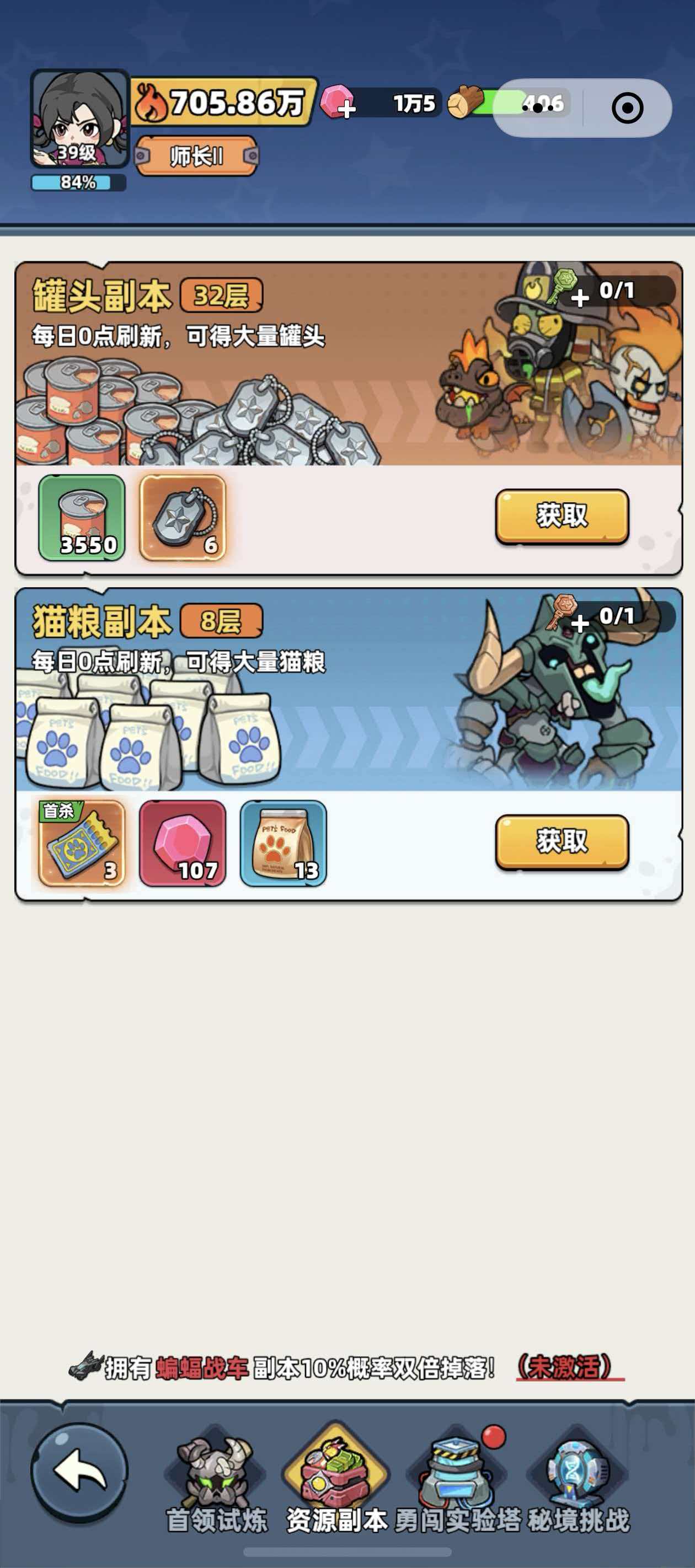 游戏中除了木材是需要大家获取的基础物资以外,还有着不少的基础物资需要大家获取,首先就是用来升级的罐头了,罐头可以通过副本、挂机工厂以及打怪等方式获得,除了罐头以外,钞票也是极为重要的物资,有了钞票玩家才能去招募幸存者,当玩家把系统中的幸存者给全都招募了以后,玩家就需要给幸存者升星了,升星需要的幸存者碎片也是要通过招募获得的,最后的资源就是猫粮了,猫粮能够提升宠物的等级,而象牙获取猫粮除了猫粮副本以外,还可以通过宠物招募以及探索房间等方式获得。