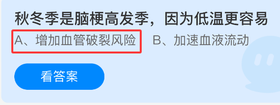 在2026年1月25日的蚂蚁庄园小课堂中,有这么一道题:“秋冬季是脑部健康问题高发季,因为低温更容易?”