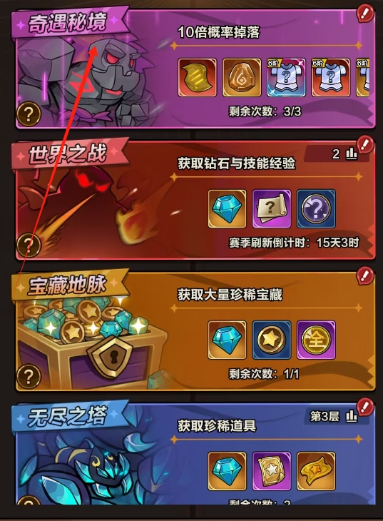 话说,当你的角色顺利通过1阶-5关卡后,历练玩法的大门就会为你敞开,而我们的主角——奇遇秘境,也会一同亮相。这个秘境呢,每天有三次挑战机会,而且最棒的是,它支持一键扫荡!简直是懒人福音,省时省力。它的关卡难度会根据你普通关卡最高的通关进度来调整,比如你最高打到了3阶-15关,那奇遇秘境的难度就和3阶-15一样。但!重点来了,它的掉落爆率可是普通关卡的足足10倍!这意味着什么?每次挑战都有极大概率能拿到品质超高的装备,什么太古、远古装备,主要就是从这里出的。所以啊,我个人觉得,每天这三次挑战机会,你最好都用完,不然真的会非常非常亏!