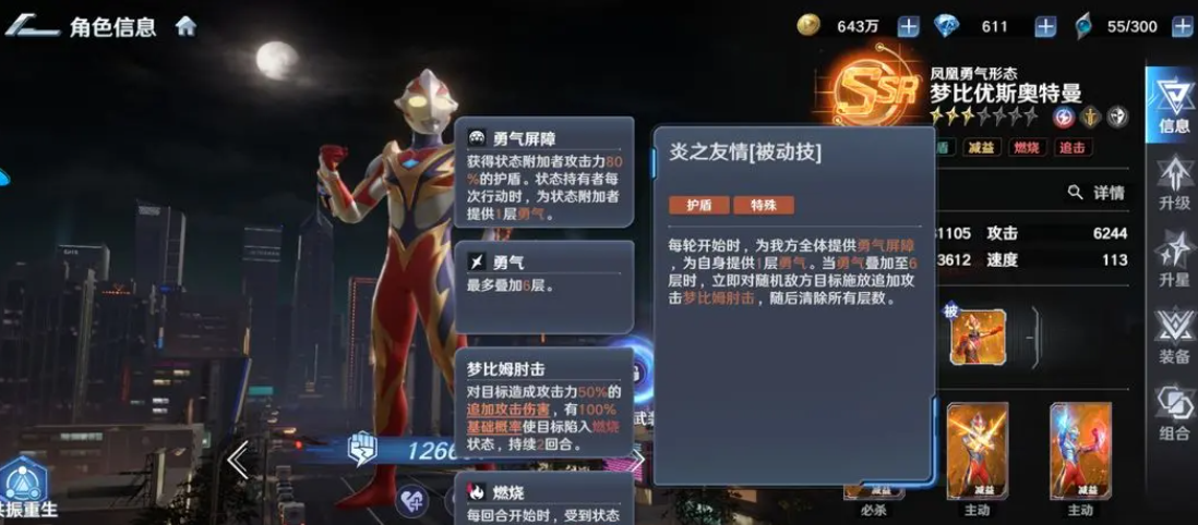 每一轮战斗开始,凤凰勇者都会为全队撑起一道“勇气屏障”。这屏障可不是摆设,它能根据自身的攻击力,给队友套上厚厚的护盾,而且队友每次行动,都能帮它积攒“勇气层数”。一旦勇气层数叠满六层,好戏就来了!它会瞬间触发一次强力的追加攻击——“梦比姆肘击”,不仅伤害惊人,还会再次给敌人附加灼烧效果。是不是很酷?这种把防御生存与能量代谢深度结合的机制,让这个角色在战场上拥有超高的容错率,玩起来也更从容。
