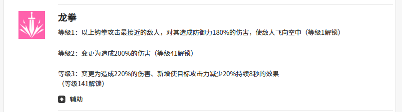 “龙拳”这个辅助技能,让克罗伊的攻击能力更添一份色彩。她会使出一记帅气的上勾拳,对敌人造成相当于自身防御力180%的伤害。这招不仅伤害可观,还有概率将敌人击飞,为后续的连招创造机会。升级后,这招还能让敌人的攻击力减少20%,简直是攻防一体!