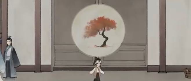 6.好的,现在轮到【袋】字了,把它拆开。然后把【衣】字放到镜子前,你会得到一个【绣】字。接着,把【绣】字和【灯】字拆开,再拆分【秀】字。最后,把【禾】和【火】这两个偏旁组合起来,一个金黄的【秋】字就出现了。等到门上的图案是秋天时,就把【秋】字放上去吧!