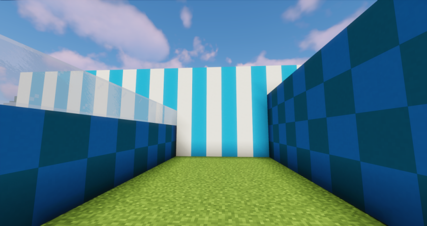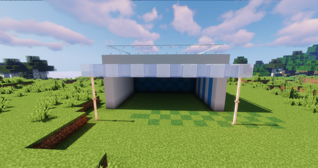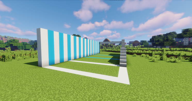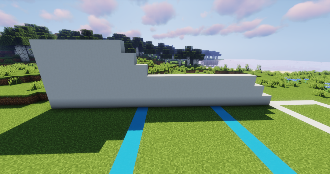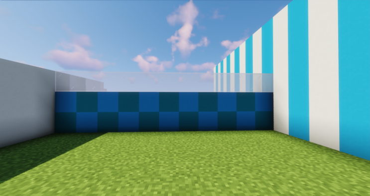 接下来就是动真格的了!我用白色和蓝色混凝土,小心翼翼地铺设出了一块长27格、宽13格的巨大地基。为了让它看起来不那么单调,特意在左边玩了点花样,让两种颜色交错放置,是不是瞬间就有了设计感?