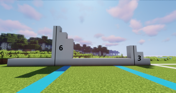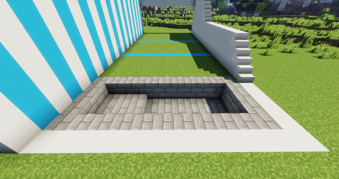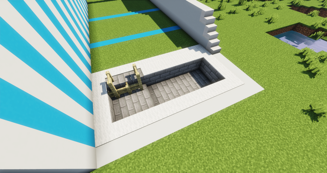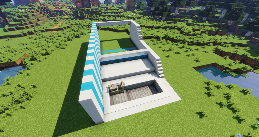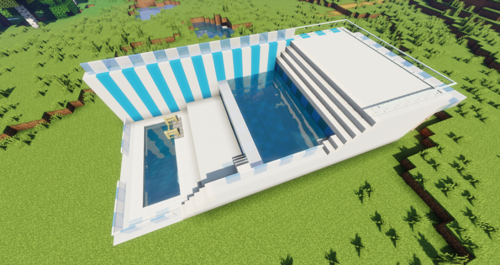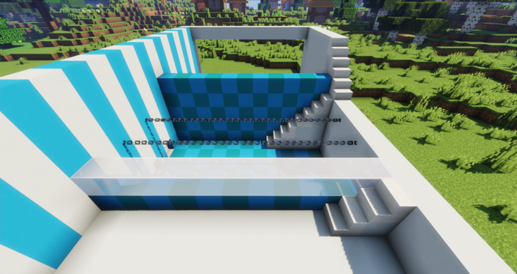 第二层,我决定来个深水区!建起墙面后,往下再拓展2格,同样用混凝土交叉放置,做出一个深邃的泳池。楼梯也得安排上,还用锁链做出了泳道,这样游泳比赛都能办起来啦!