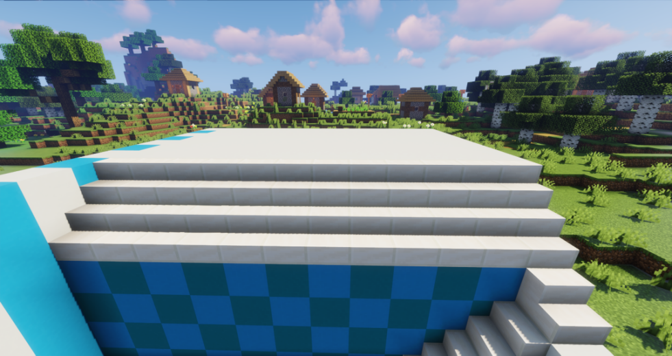 泳池可不是一个大坑那么简单,得有层次感!首先是第一层,我挖了一个5x11x2的区域,用石砖和石砖阶梯填充,还用栅栏做了一个小巧的泳池楼梯,方便大家下水。四周再用白色地毯轻轻覆盖,瞬间温馨了不少。