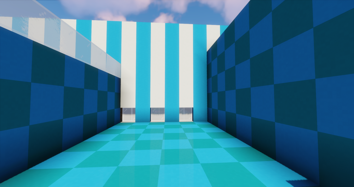 接着,用白色混凝土搭建了一个高于地面1格的平台,然后又用蓝色和青色混凝土再搭高1格。混凝土上再放上白色染色玻璃,这样搭出来的效果,是不是很有现代感?
