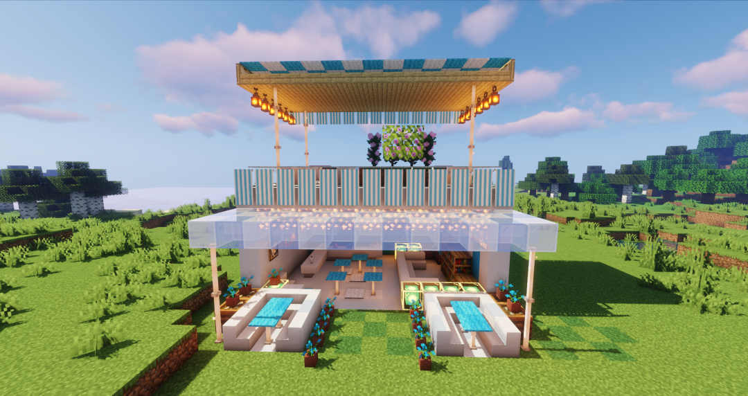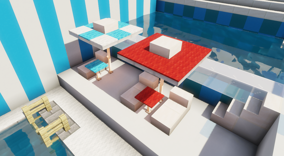 光有泳池可不行,还得有点遮阳避雨的地方。我绕到建筑后方,用末地烛和蓝白染色玻璃,巧妙地拓展出了一个漂亮的大棚,既实用又美观。