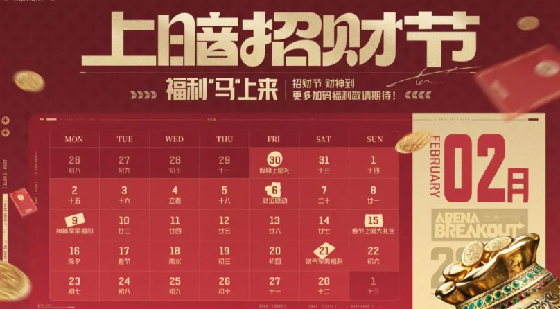 版本节奏方面,2.6版本将上线财运联动内容及马年专属大金;2.9版本开启军需福利活动,内容设计更具悬念感;2.15起发放春节大礼包,内含限定大金礼盒、装扮券、套装及枪械涂装等多重资源;2.21版本则推出财气军需福利,进一步丰富玩家获取路径。
