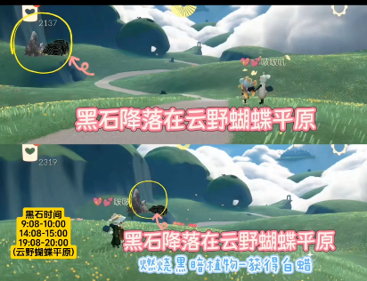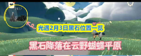 光遇2月3日落石位置在云野蝴蝶平原(图一),性质为黑石。出现时段为9:08-10:00、14:08-15:00、19:08-20:00。玩家需在规定时间内前往清理黑暗植物(具体落点为地图随机一处),完成后可获得白蜡烛,但无法完成季节任务。