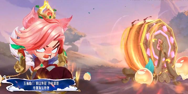 2、淘汰特效:战斗胜利后,瑟提会挥出巨型寿桃拳命中对手小小英雄,同时周围绽放大型烟花。