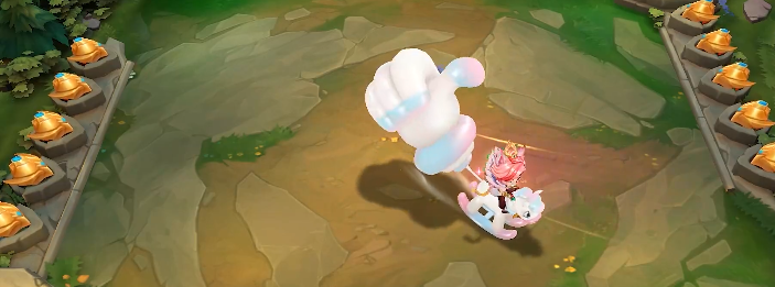 “五福临门·南山寿星”小小瑟提的特效融合了新春贺岁与寿星主题,以金色与深红为主色调,围绕“寿桃”元素展开。其攻击时会挥出裹挟红霞的金色寿桃拳,命中后呈现寿桃炸裂效果;胜利淘汰对手则触发巨型寿桃拳与烟花绽放。此外,小小瑟提还拥有吃寿桃、做仰卧起坐、佩戴寿星面罩以及乘坐彩虹小马摇摆等多款趣味动作,整体喜庆而富有活力。