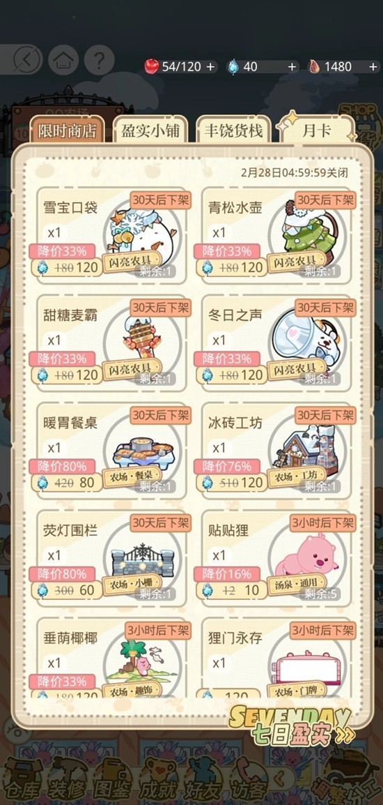 这次还有限定农具哦!在百货商店里,每件农具需要120雨露兑换;而在购物3区礼包中,每件则需要4北极星。那么,哪种方式更划算呢?