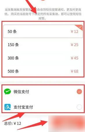 3、在短信报警窗口,选择购买套餐条数、支付方式,单击【确认支付】选项。