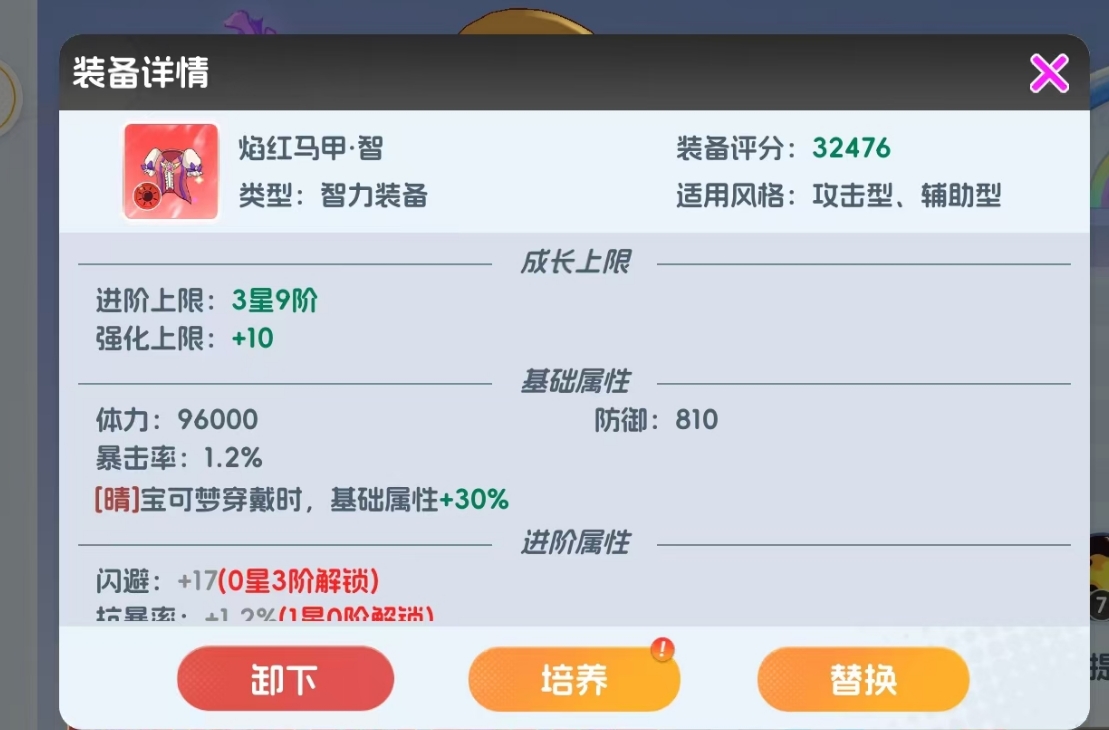 配装方面,超级喷火龙与小火龙一样都是攻击型宝可梦,走的是法伤路线,所以要给它穿戴智力装备,且装备上最好带幻阵营加成或晴阵营加成,作为幻、晴双属性的超级喷火龙可同时吃到这两种阵营加成,能极大提升它的属性强度。此外,武器属性最好洗出吸血、法伤加深、忽视异常抗性、暴击率/攻击加成,若能用高级洗练石洗练出小火龙专属词条那就再好不过。
