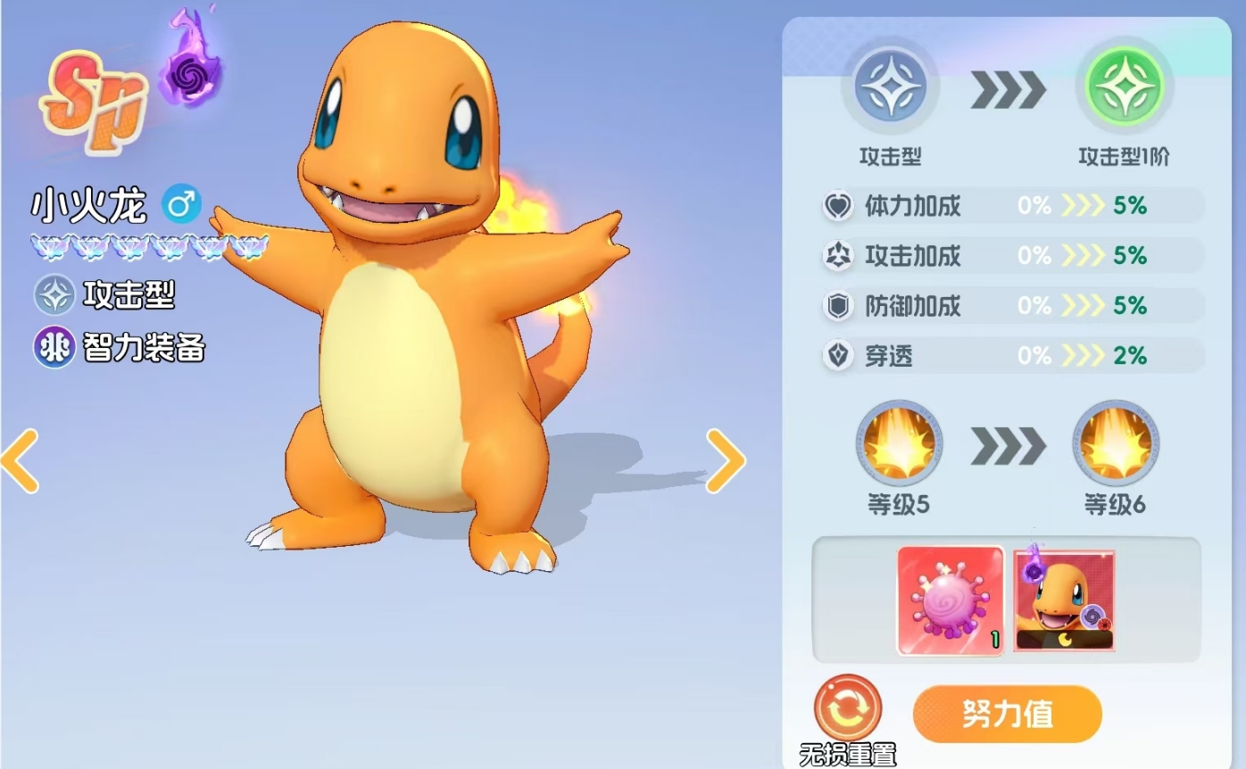 此外,超级喷火龙的养成方式也比较简单,毕竟玩家在完成小火龙的MEGA进化时,本身就已经在它身上投入了不少养成资源,所以拿到手的超级喷火龙本就具备着不错的练度,后续只要继续为它升阶,帮助它提升至品阶上限,基本就能完成养成。有条件的玩家还可通过消耗增强剂,在锻炼功能中强化它的力量、技巧和耐力,以此来增强它的体力、攻速和防御,亦或是在努力值功能里消耗宝可病毒,提升它的努力值。当然,招式精通、升级、MEGA进化升阶这些变强途径也不要忘记。