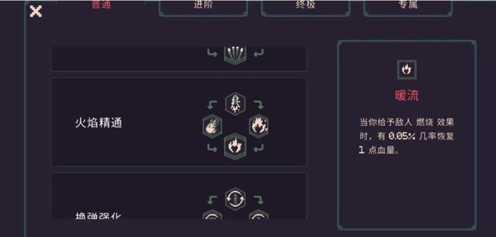 如果玩家后期已经刷到了炎晶跟暖流,在天赋方面已经有了明确的方法,在这样的情况下,先把所有和点燃火焰相关的天赋直接给加满。当这一步做完之后,玩家其实生存能力就会大幅度的提高,接下来再补换弹、速度和各类攻击天赋,输出和操作流畅度其实就会有所提升,此时玩家这时候不管是碰到小怪物还是直接去打大Boss,玩家的实力都是比较强悍的。