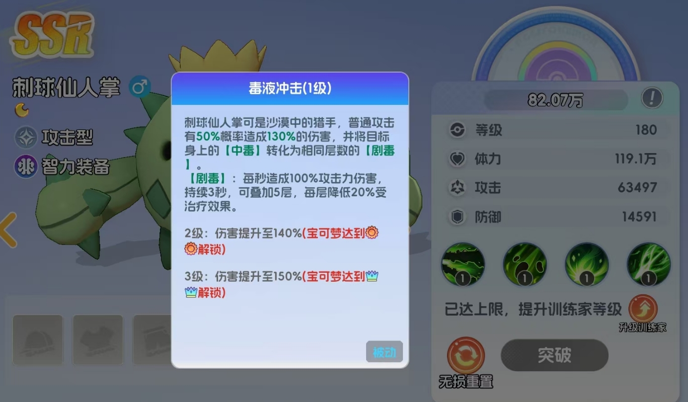 刺球仙人掌是SSR级攻击型宝可梦,隶属于风阵营,其攻击以对敌人造成法术伤害为主,且能通过多重手段为敌人施加中毒效果。释放终结技时,刺球仙人掌会向敌人喷射出毒刺,随机攻击处于自己面前的敌人,并对它们施加中毒效果。每道毒刺所造成的中毒效果都会独立计算,敌人每被毒刺攻击到一次,都会被叠加一层中毒,最多能叠加五层。受到中毒效果影响的敌人不光会受到基于刺球仙人掌攻击力的持续伤害,还会根据中毒层数降低自己所受到的治疗效果,每层降低10%,能变相削弱敌人的持续作战能力。