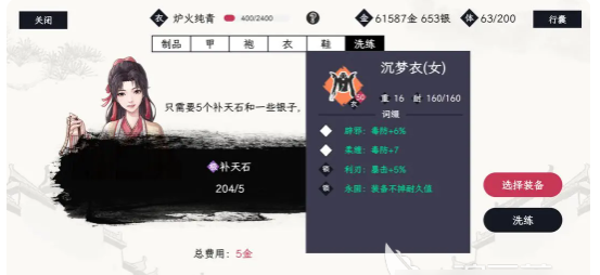 洗练的门道就在裁缝铺,还有铁匠铺。找到NPC之后就可以开启重塑装备的旅程。每一件装备的初始词条全部都是随机生成的,可能是物理性攻击加成,也可能是法防属性,一切都只是看个人的运气。通过洗练就可以让不如意变得可改变,只需要消耗5块补天石,还有少量的银子,就可以刷新词条的列表。从物理性攻击到法术攻击的属性中,找到一个让自己满意的搭配即可。