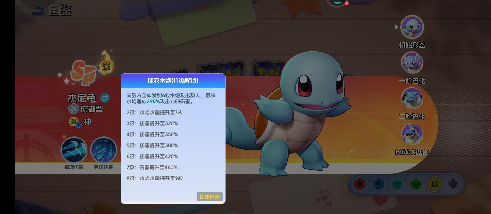 加农水炮是11级时解锁的,这就是杰尼龟的群体输出核心,每一枚都有290%的攻击力伤害。在6级时伤害就可以提升到420%。8级时更能发射9枚水泡,可以覆盖所有的敌人。不同于大招的持续压制,加农水炮是瞬间爆发的清场能力,在面对敌方残阵时,就可以扭转战局。作为物理伤害技能,可以和杰尼龟的攻击属性完美的符合在一起,让它可以打出较高的输出。