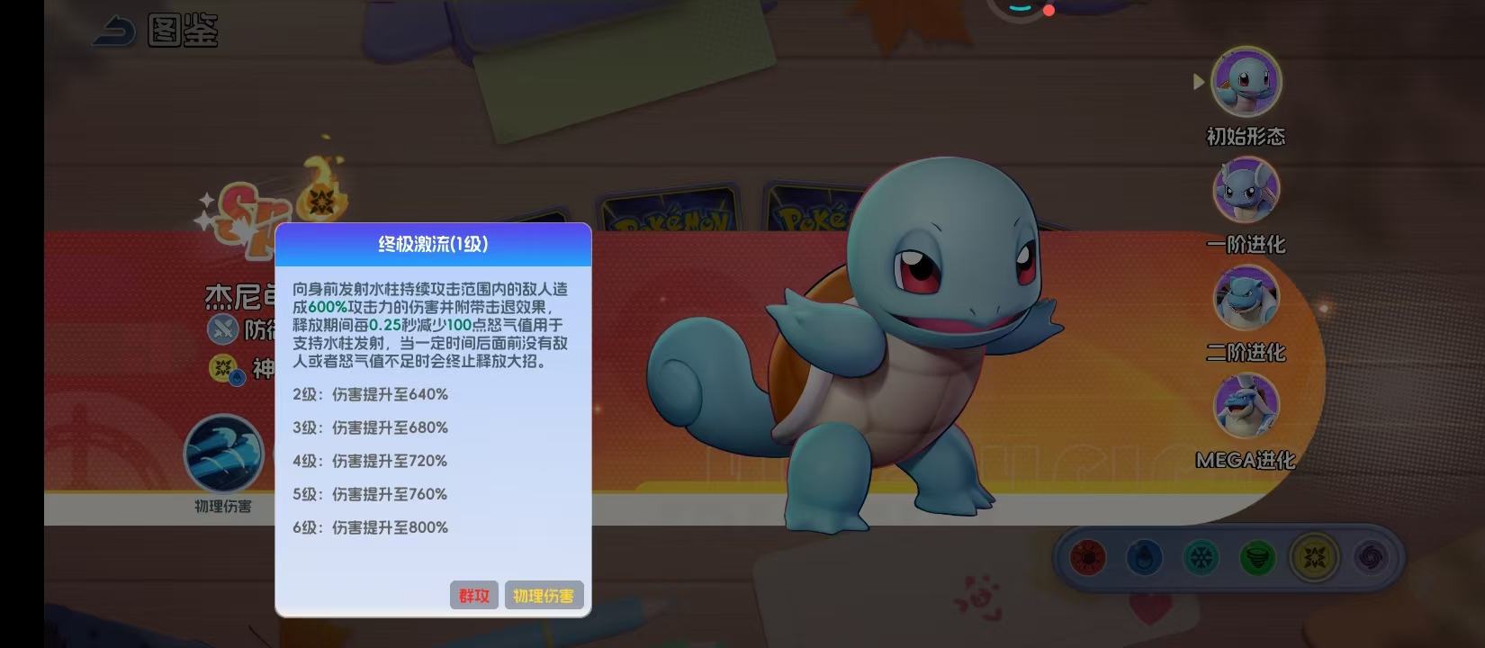 杰尼龟的大招就是极具侵略性的终极激流。向着前面喷射的水柱,并不是很简单的线性攻击,而是会持续压制范围内所有敌人。一级时就会拥有600%的攻击力伤害,并且有击退的效果,可以打乱敌方的阵型。随着技能等级提升,伤害就会慢慢的提升到800%,每0.2秒都会消耗100点怒气。这一个设定就能让输出还有战场的节奏深度的绑定在一起,一旦在怒气耗尽之后,大招就会自动的终止。