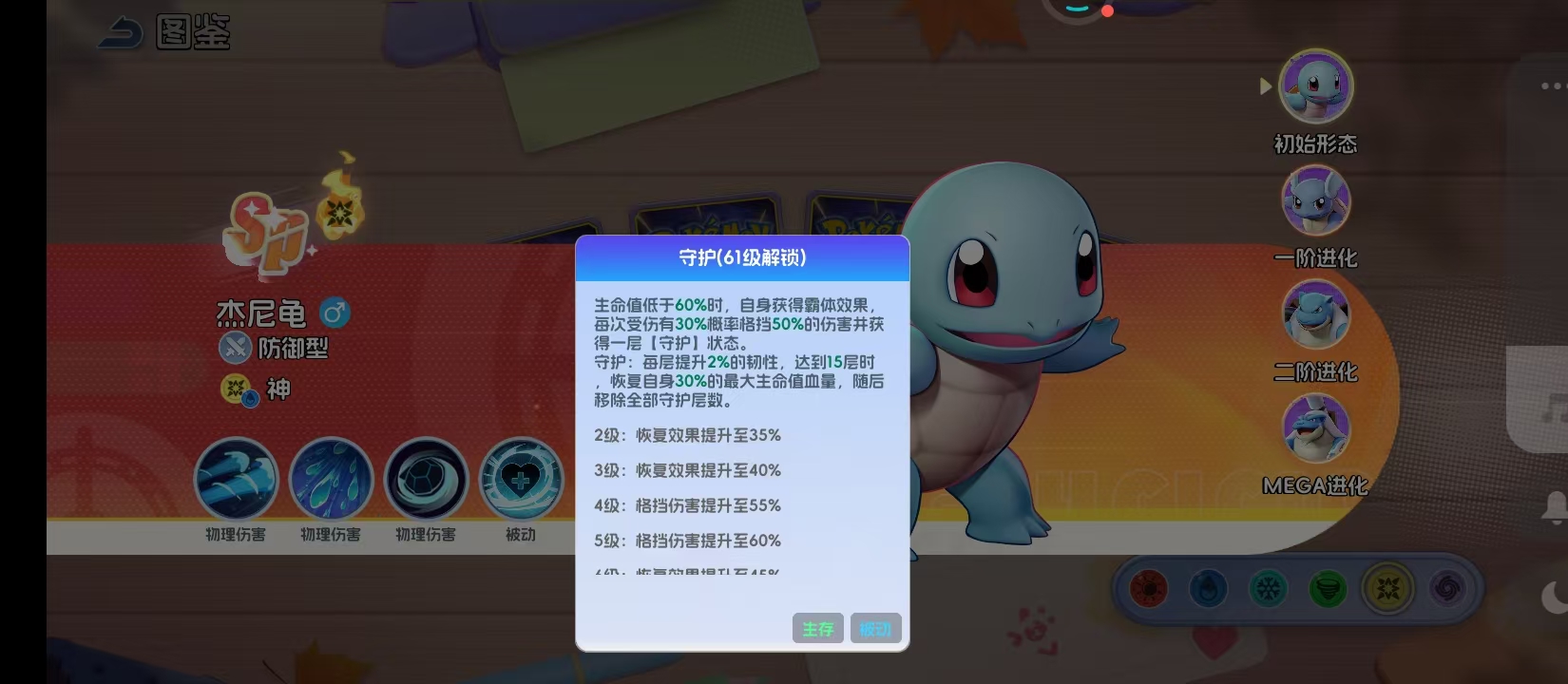 61级解锁的守护技能,当生命值低于60%之后,杰尼龟就会进入到霸体的状态,每一次受到攻击都有30%的概率格挡50%的伤害。并且还会叠加一层守护状态,每一层守护提升2%的韧性,15层之后就可以恢复30%。这就意味着杰尼龟的血线越低,生存的能力也就越强,在残血的状态下也能够实现翻盘。