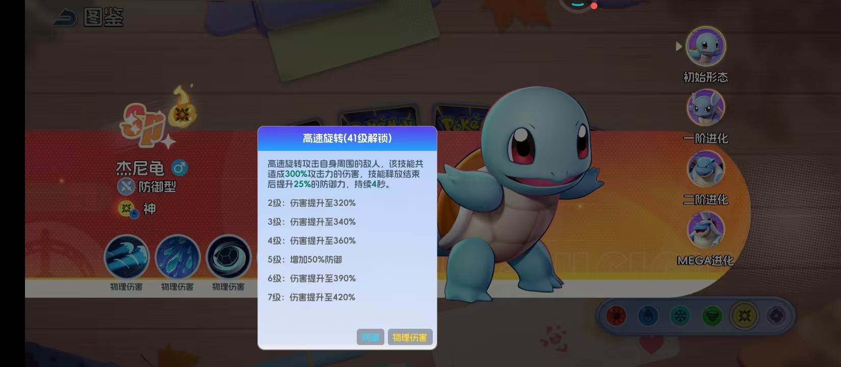 41级解锁的高速旋转就能演绎杰尼龟的防御型定位,主要是以自身作为中心旋转攻击,可以造成300%的攻击力伤害,在技能结束之后还可以提升25%的防御力。5级时还能够增加50%的防御,会有持续4秒的时间,这就让杰尼龟在近身战斗时具有如鱼得水的优势。让后续承受的伤害就能大幅度的降低,在PVP中,这一个技能是他切入敌方后排打乱节奏的关键。