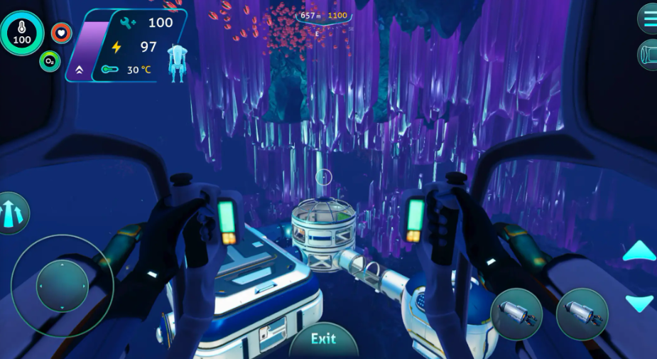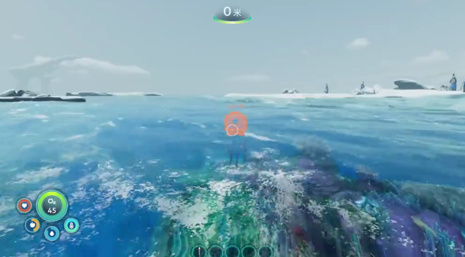 随后玩家们就可以直接前往水内开始探险了,在水面上会有极寒天气的影响,到了水面之下,玩家们就完全不用担心了,水下的物资还非常丰富,例如铅块一类的矿物,玩家们都可以获取,由于开局的道具比较少,所以玩家们开始的大型物资都是没有办法获取的,但是小型物资还是需要关注一下,当玩家们在水下之后,也要注意一点,那就是氧气,水下缺氧时会有提醒,此时玩家们就需要迅速上浮获取氧气。这一阶段直接前往吊舱就可以将氧气补满了,吊舱属于玩家们的基地,这里还有一个工作台,可以帮忙玩家们制作其他物品。