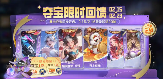 暴击夺宝限时开启,官方直接送20抽暴击夺宝券,暴击夺宝获得随机典藏的基础概率提升至非本期活动期间的三倍,如果要随意典藏的话,暴击夺宝更容易抽到典藏奖励。