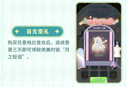 购买任意档位首充后,连续登录三天即可领取绝美时装“月之轻语”。
