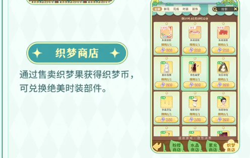 通过售卖织梦果获得织梦币,可兑换绝美时装部件。