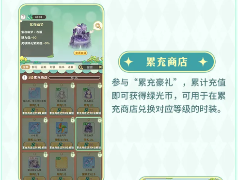 参与“累充豪礼”累计充值即可获得绿光币,可用于在累充商店兑换对应等级的时装。
