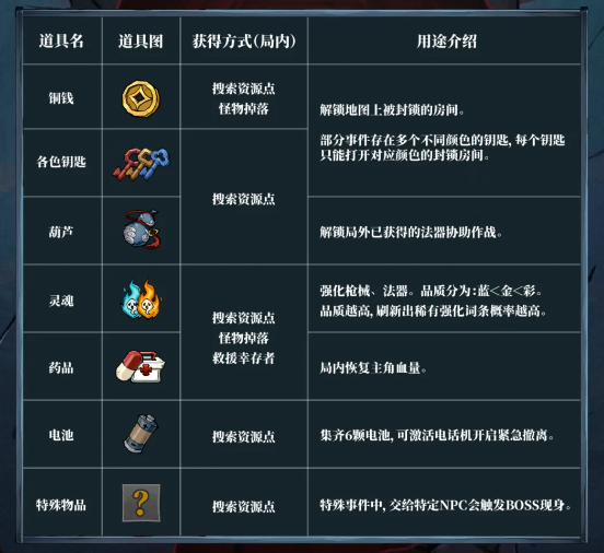 无限轮回中,事件道具可通过搜索资源点、怪物掉落或救援幸存者获取。锎钱和钥匙用于解锁封锁房间;葫芦可召唤法器助战;灵魂用于强化枪械法器;药品恢复血量;集齐6颗电池可开启紧急撤离;特殊物品交给NPC可触发BOSS现身。