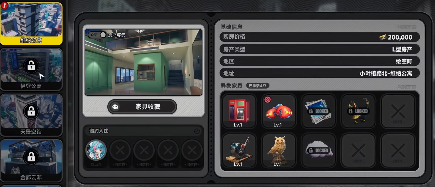 房产购置也是都市大亨里比较重要的一块内容。游戏里的房子分了好几个价位,最便宜的20万就能买下来,最贵的别墅要800万。不同房子除了价格不一样,提供的增益效果也有区别。小户型的房子,只能邀请一个角色入住,800万的豪华别墅可以同时住五个人。而且别墅里还藏着一个特殊副本,刷这个副本消耗体力的同时,也能获得方斯。
