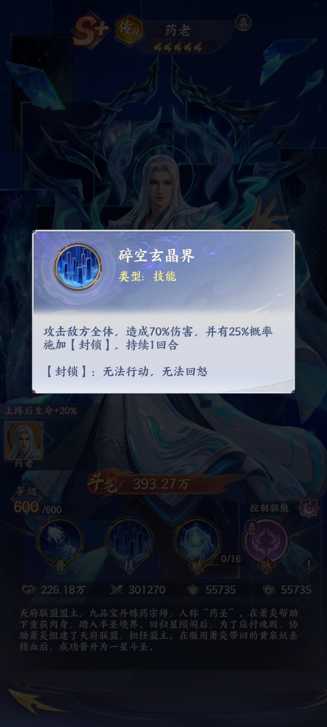 玩家如果想要知道药老的玩法,其实就需要知道药老的技能特点。药老既然是传说类型的斗者,他其实实力是比较强悍的,主要是控制的作用。简单来说就是在战斗的过程当中能够起到控场的效果,并且还能够达到增益的作用。所以说玩家在合理运用药老的时候,一旦施展普通攻击技能玄冰锥。虽然是基础攻击,但是能够对敌人造成高额的伤害,他也是稳定输出的辅助。