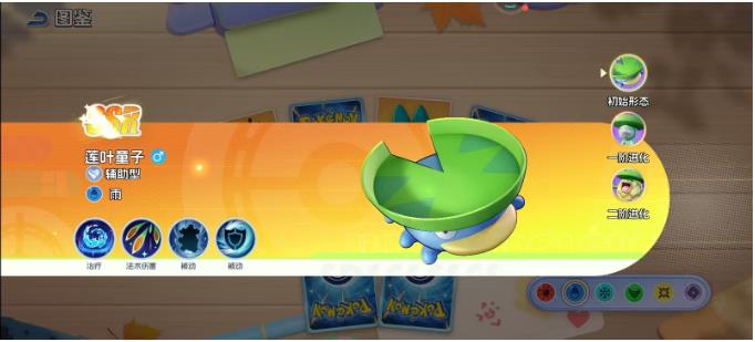 莲叶童子一开始头顶会有一片翠绿的叶子,但是此时就能够展现出辅助的天赋。作为一个拥有雨属性的辅助型精灵,他的技能早就已经点亮法术伤害还有治疗,两个被动技能可以给后续的进阶直接埋下伏笔。此时的他就好像是刚刚进入到战场的新手,虽然没有具备强大的辅助能力,但是却用基础的治疗技能给所有的队员续航始终都会承担着守护的作用。