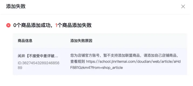 解决:请确保您复制的是商品在抖音小店、精选联盟、淘宝、京东等平台的直接、有效的商品详情页链接。建议在浏览器中打开该链接,确认能正常加载商品页面后再进行粘贴添加。