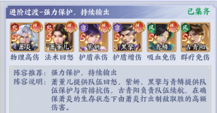 核心成员:萧炎(物理高伤)、萧薰儿(法术回怒)、紫妍(护盾承伤)、黑擎(护盾增伤)、青鳞(吸血免伤)、古青阳(群疗免伤)。