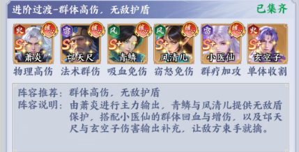核心成员:萧炎(物理高伤)、邱尺尺(法术瞬伤)、青鳞(吸血免伤)、风清儿(窃怒免伤)、小医仙(群疗加攻)、玄重子(单体收割)。