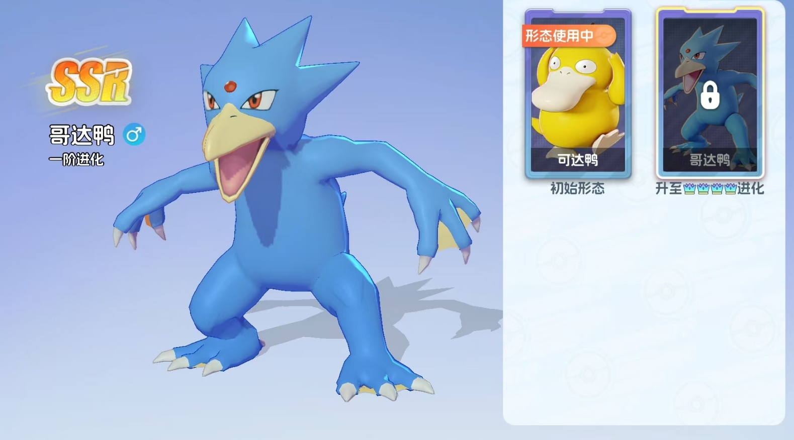 哥达鸭是可达鸭的一阶进化形态,当可达鸭升阶到皇冠4阶后,便能解锁哥达鸭形态,玩家能在进化切换里将可达鸭的形象变更为哥达鸭,并让它以这一形象出现在战场上与敌人对战。同时,玩家们将可达鸭进化成为了哥达鸭后,它会继承可达鸭之前的全部技能,且不会像MEGA进化那样获得新技能,因此玩家们之前如何使用可达鸭,在它进化后可继续以同样的方式来使用哥达鸭,不需要去进行更改。