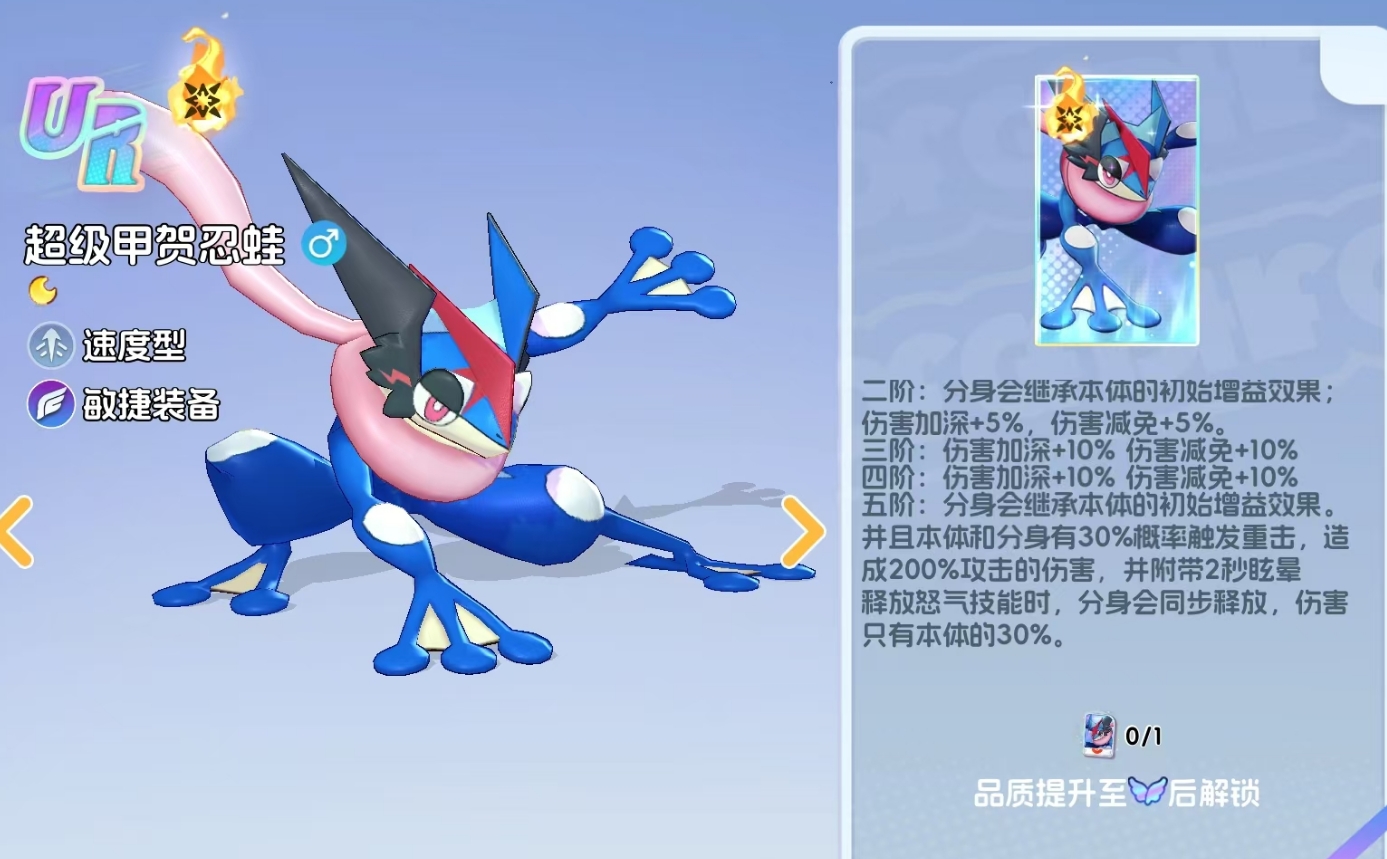 此外,呱呱泡蛙也是一只能进行MEGA进化的宝可梦,且在完成进化后,它还能进一步强化分身的能力,让分身在释放出来后就能继承本体所获得的增益,令分身造成的伤害得到进一步提升。如果能将呱呱泡蛙的MEGA进化升到满阶,不管是本体还是分身都会在攻击时概率触发重击,在对敌人造成200%攻击力倍率伤害的同时,还会令受击敌人陷入眩晕,甚至分身还会在本体释放终结技时跟着一起释放,强度提升非常大。