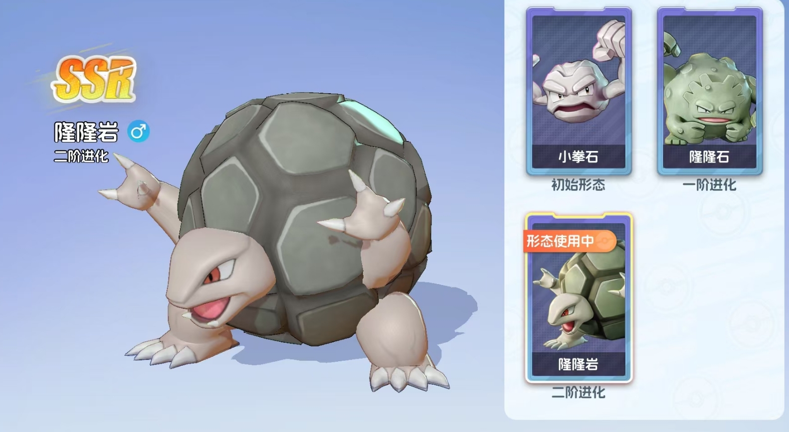 完成二阶进化后,小拳石便能进化成为隆隆岩,这也是该宝可梦目前最高阶的进化形态,并且该宝可梦在技能的设计上也与它的定位相符,能很好地充当队伍里的坦克,为队友承伤。其被动结实会很直接地提升隆隆岩的血量,且被动的等级越高,血量提升的幅度也就越大,最高能提升22%。另一被动变圆则是强化了它的承伤能力,每次受伤都不会超过最大生命的7%,而且在受到超过5%最大生命的伤害时,还能为自身叠加防御,令自己的坦度变得更高。
