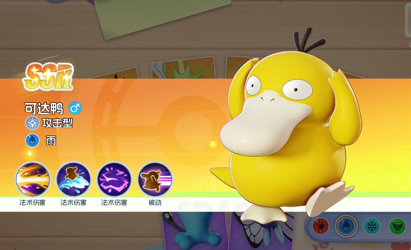 可达鸭是雨阵营中的一员,作为攻击型宝可梦的它以法术伤害为主,且所有主动技都能在释放时攻击到多名敌人。其大招为破坏死光,可瞄准距离自己最近的一名敌人发射,且不管死光是否命中目标敌人,它都会形成一条路径,任何处于死光路径上的敌人都将吃满大招的伤害。该技能初始别率就有570%,升满后伤害倍率更是会达到900%,伤害特别的夸张,死光的范围也较大,即便敌人刚好处于移动状态,也很难在可达鸭释放时走出死光的影响范围。
